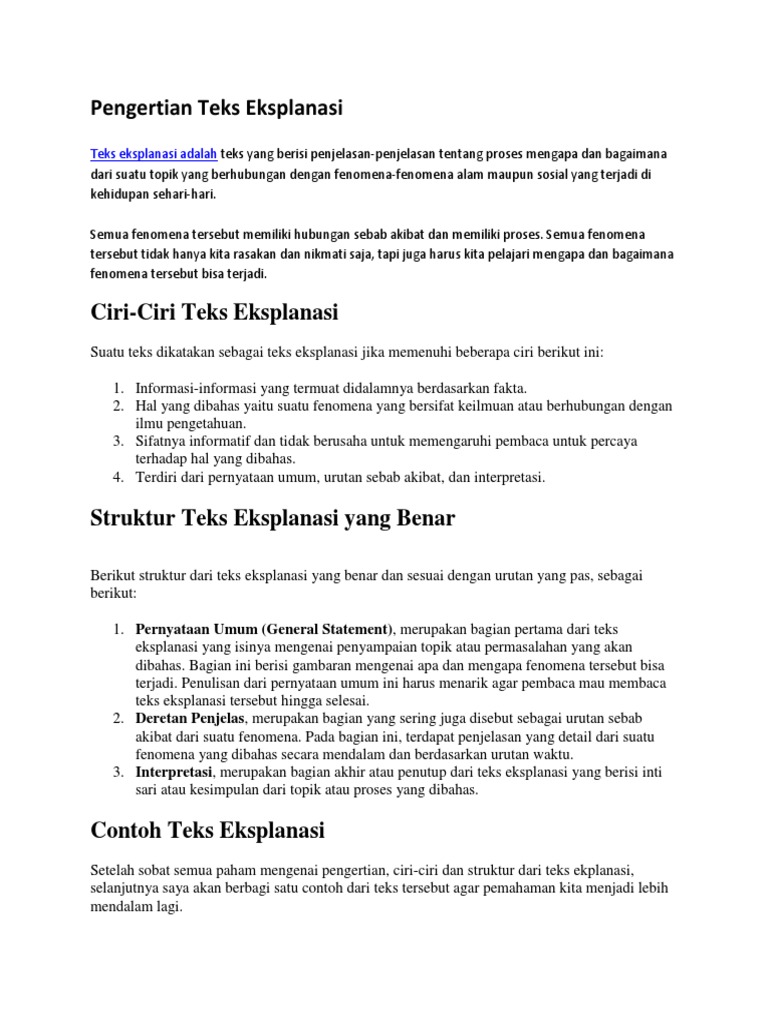 Jadi teks eksplanasi adalah salah satu jenis teks yang bertujuan untuk menjelaskan sebuah.